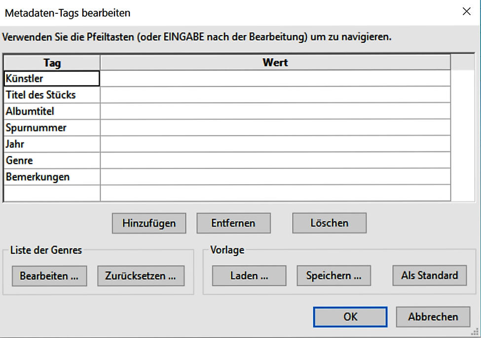 Nachdem alle Textmarken korrekt gesetzt wurden, kannst du die Tags vergeben. Über das Menü Datei/Metadaten kannst du alle wichtigen Informationen, wie z. B. Künstler, Titel des Stücks, Titel der CD, Spurnummer, Jahr, Genre, Bemerkungen, angeben.
