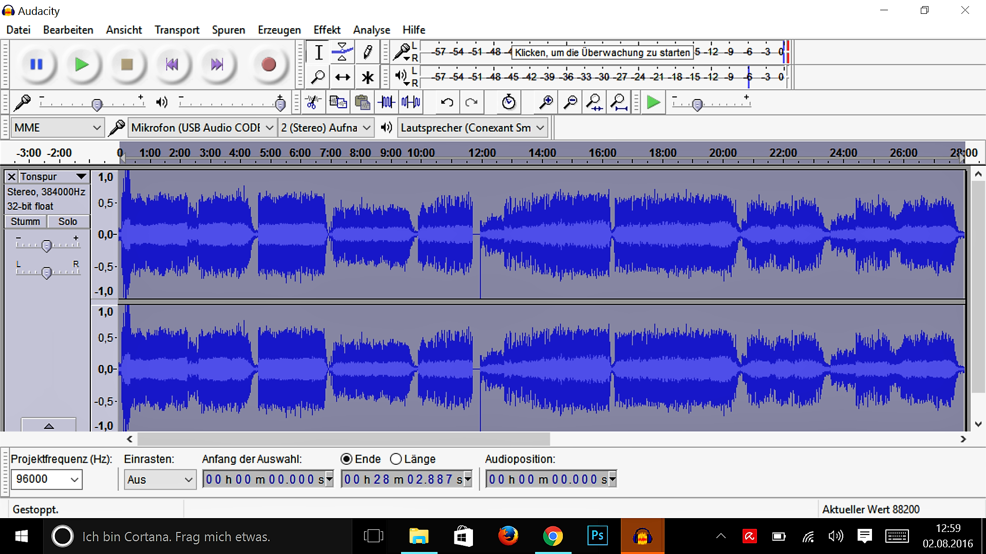 Der Audio-Editor muss das Rauschen bzw. die Störung, welche abgeschwächt werden soll erst “kennenlernen”. Hör dir die Aufnahme an und markiere einen Teil, wobei das Rauschen und Knistern besonders gut zu hören ist.